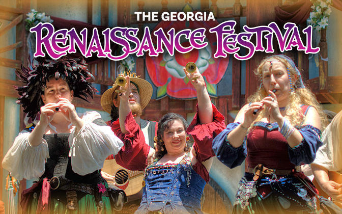 The Georgia Renaissance Festival comes to life every Saturday, Sunday and Memorial Day, April 15 through June 4, 2023, rain or shine from 10:30am to 6:00pm. Visitors to this unique Festival will be greeted by 16th Century Royalty and hundreds of costumed villagers. Feast like Royalty on giant roasted turkey legges and frothy ales while enjoying the full armored Joust. Kids of all ages will enjoy the challenging games of skill, thrilling people-powered rides and continuous comedy and circus-style shows on 10 stages. It’s a whole lotta’ fun and a little bit of history at the 38th Annual Georgia Renaissance Festival.